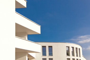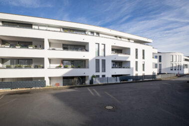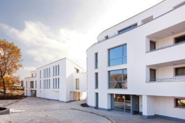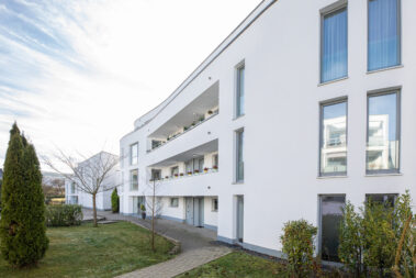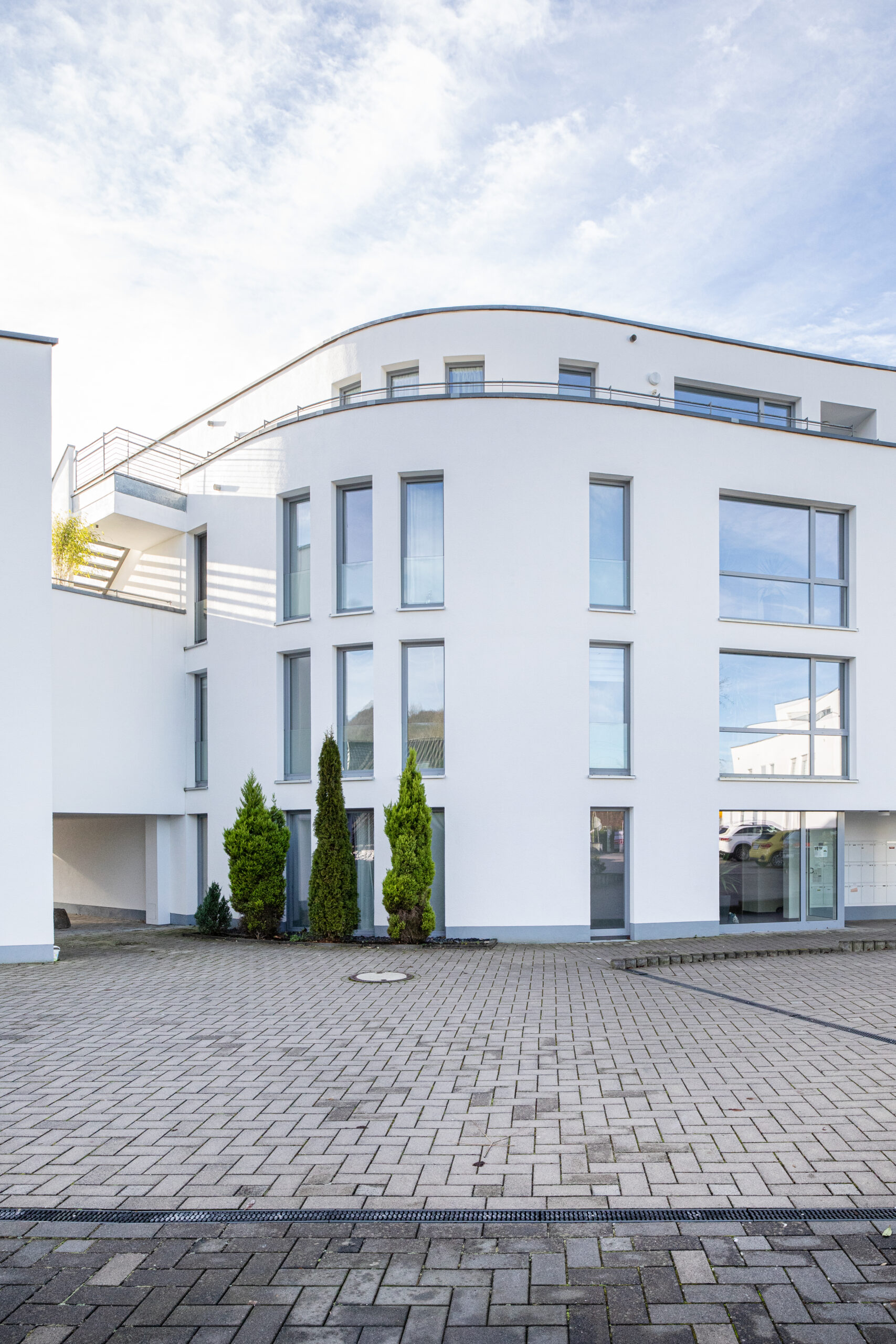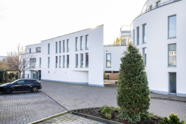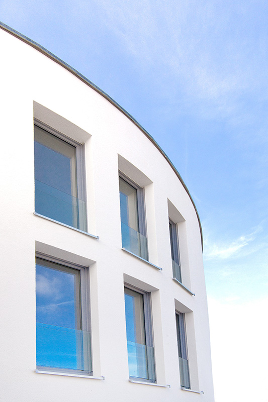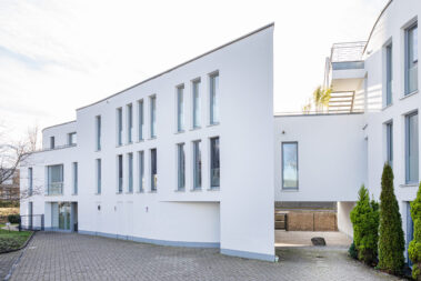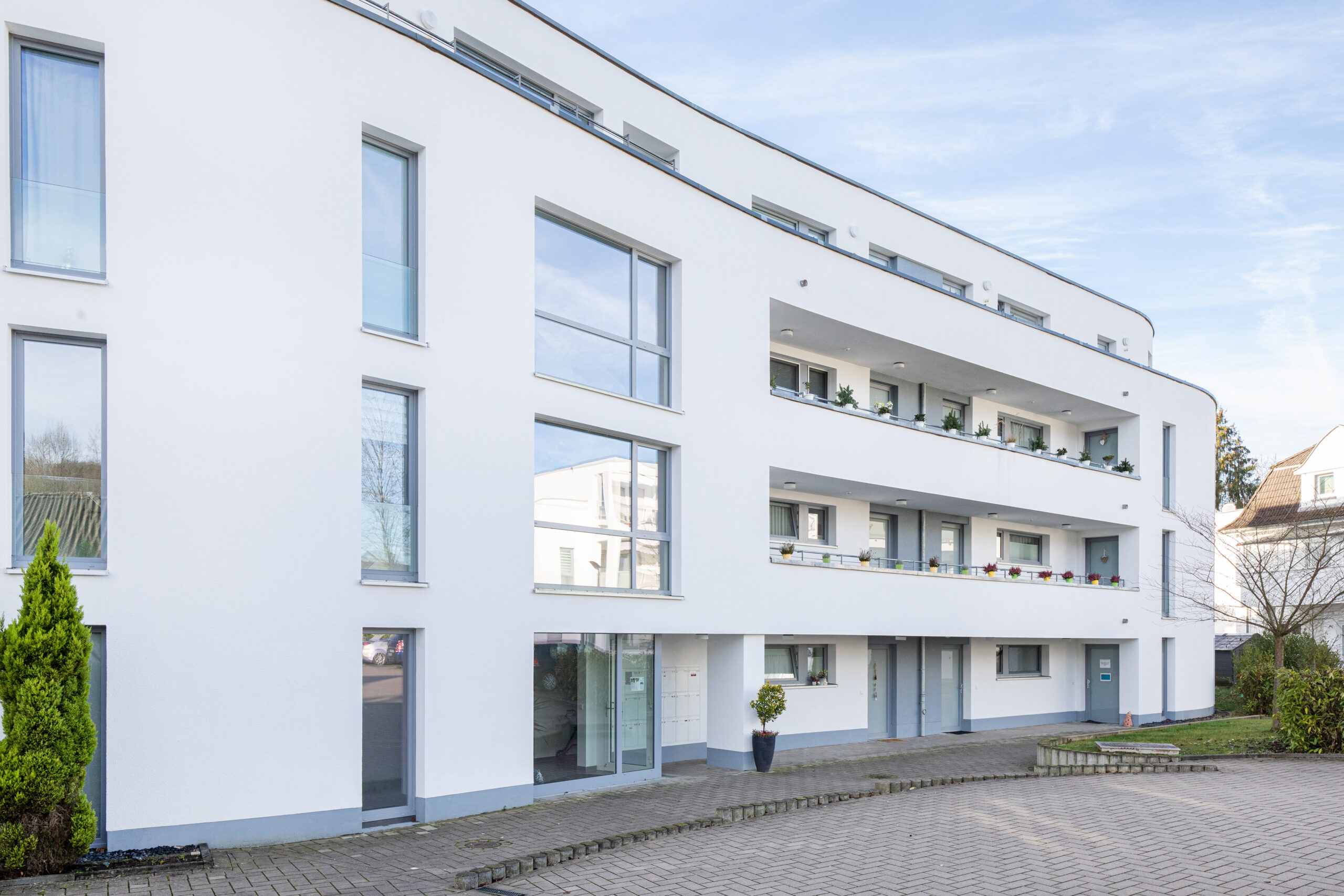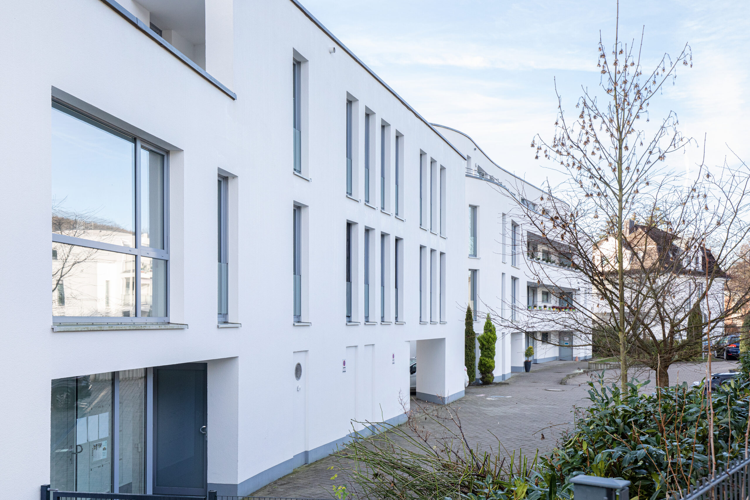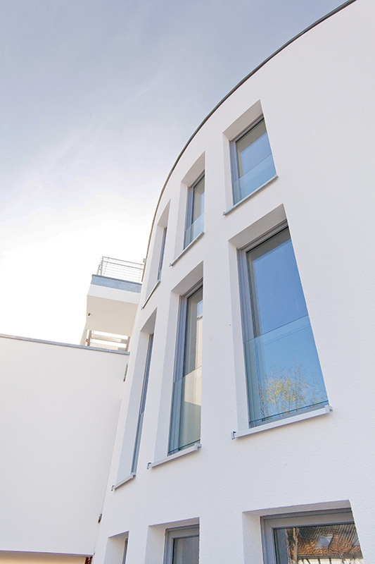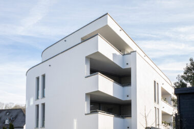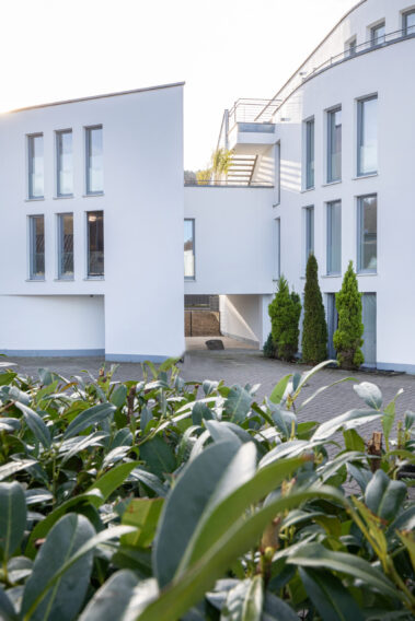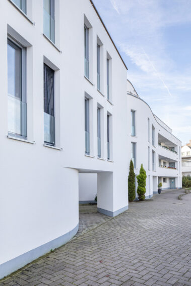 Mit 27 Wohneinheiten steht das Gebäude für eine moderne, klare Formensprache und hochwertige Ausstattung. Die geschwungene Fassadengestaltung und bodentiefe Fenster prägen das äußere Erscheinungsbild und schaffen lichtdurchflutete Wohnräume.