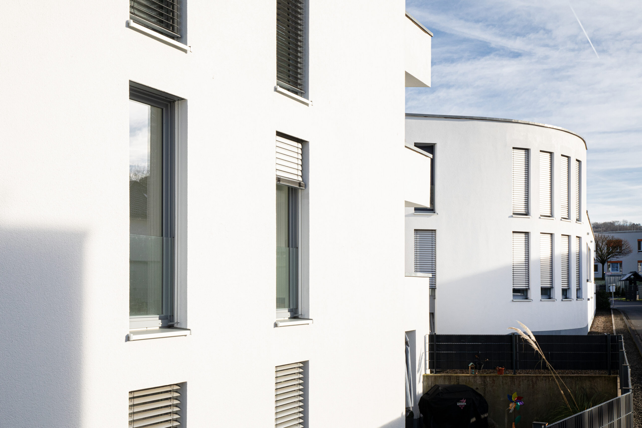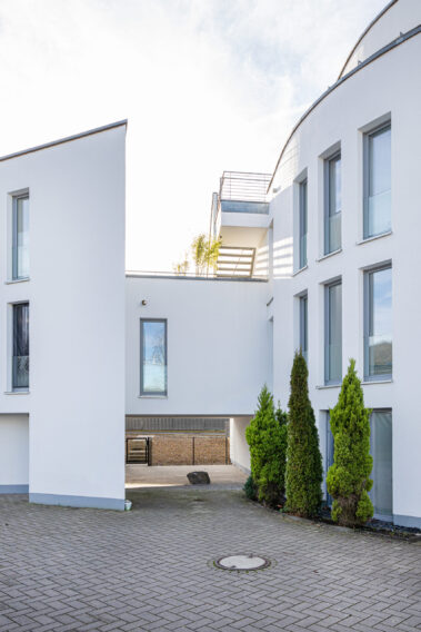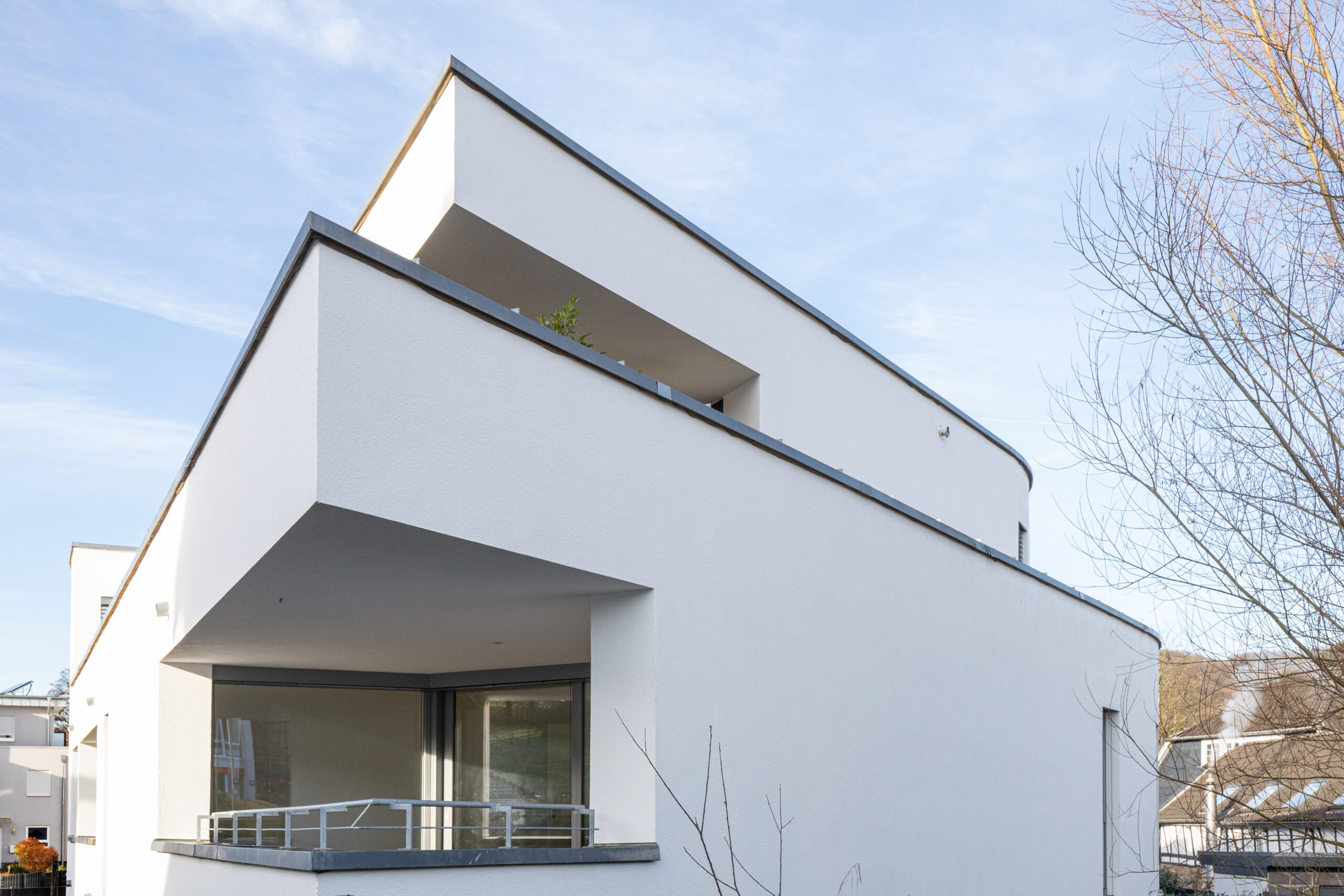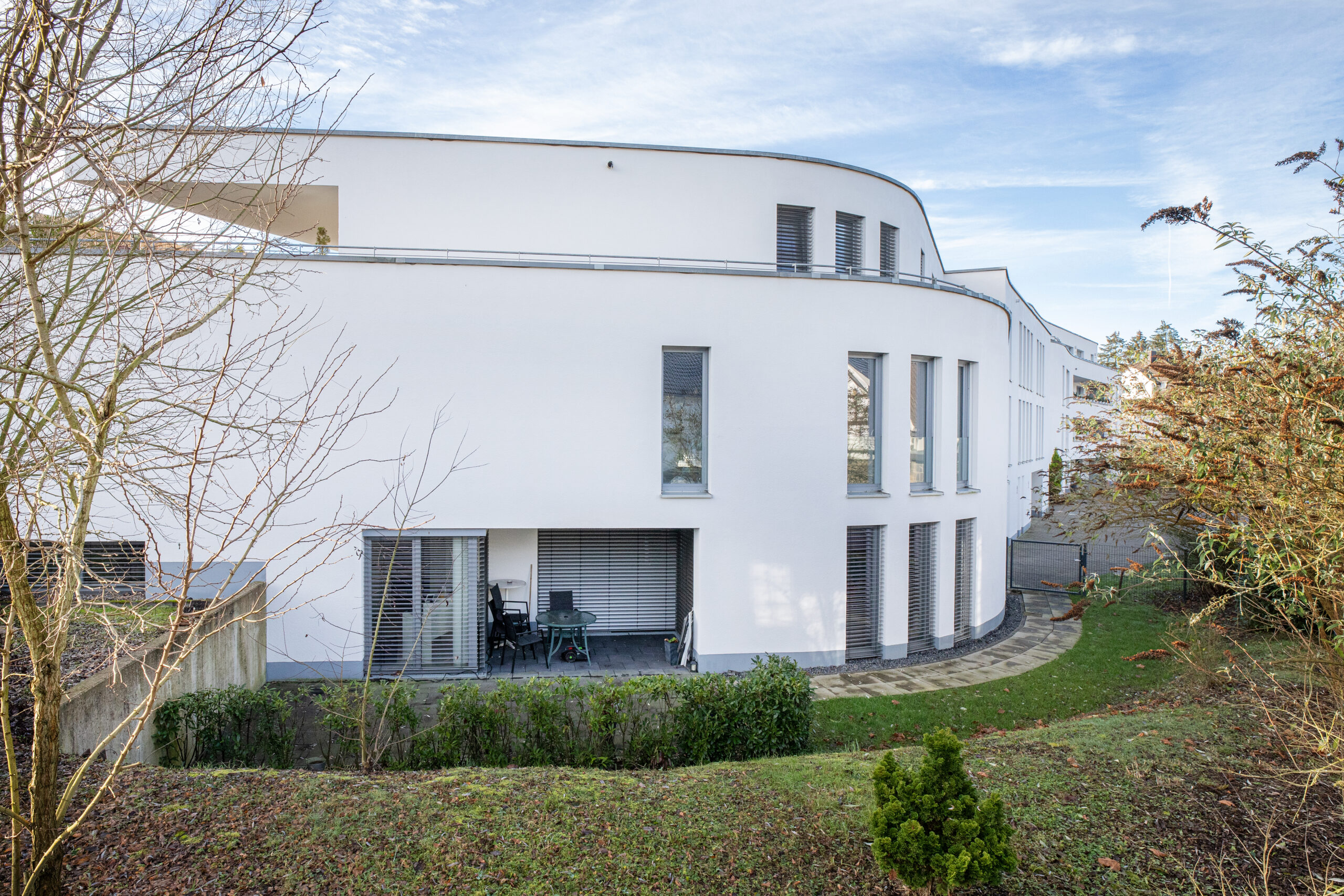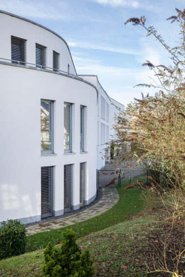Die Architektur des Hauses verbindet zeitgemäße Gestaltung mit funktionaler Wohnqualität. Die geschwungene Fassade verleiht dem Gebäude eine eigenständige Präsenz im Straßenbild und unterstreicht den Anspruch an gestalterische Qualität.