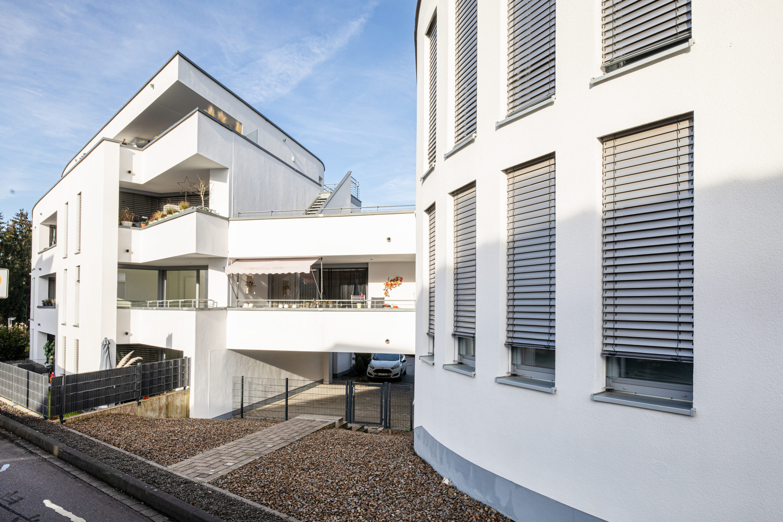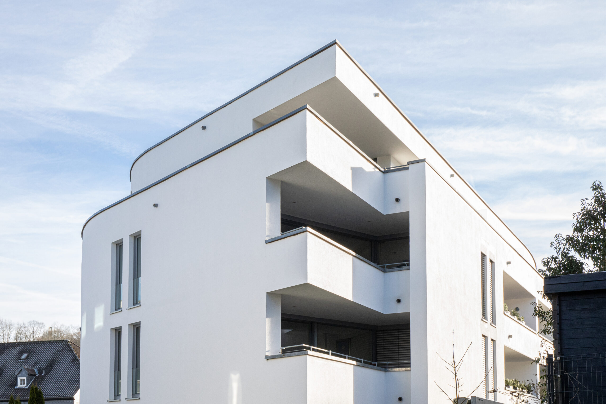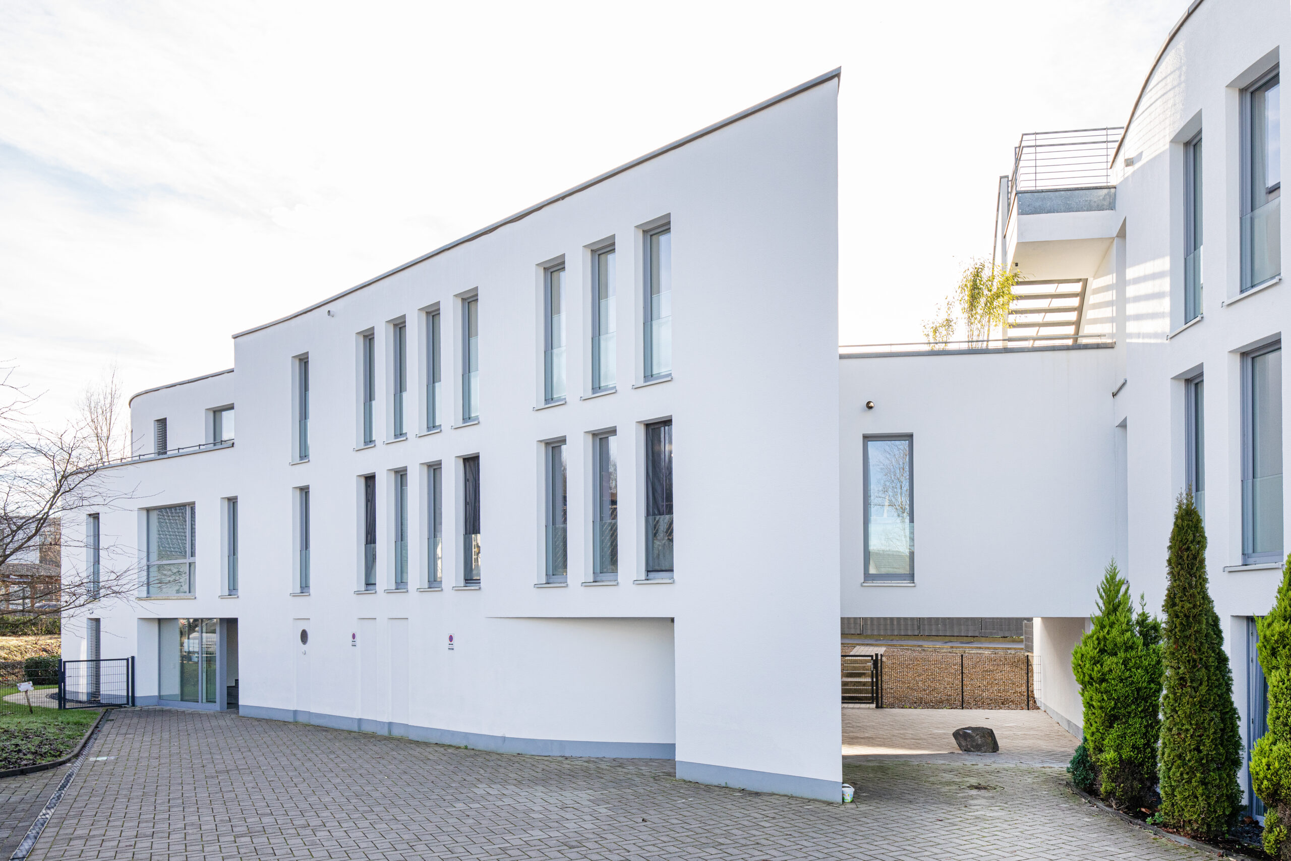 Die Architektur des Hauses verbindet zeitgemäße Gestaltung mit funktionaler Wohnqualität. Die geschwungene Fassade verleiht dem Gebäude eine eigenständige Präsenz im Straßenbild und unterstreicht den Anspruch an gestalterische Qualität.